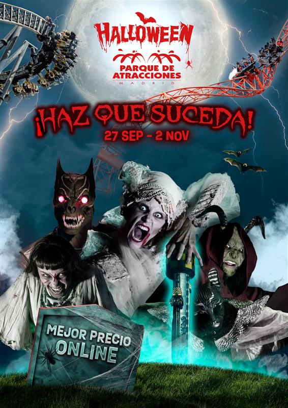 ¡Halloween! Mejor precio ONLINE Ven a Parque de Atracciones de Madrid del 27 de septiembre al 2 de noviembre a disfrutar de la época más divertida y escalofriante del año. Fantasmas, zombies, brujas, monstruos y demás criaturas te estarán esperando para disfrutar junto a tu familia o amigos. Descubre nuestros dos nuevos pasajes infantiles: -El Castillo Misterioso. -La Pirámide Maldita. Vive emociones fuertes en nuestros pasajes del terror: -Asylum. -El templo de Shanarkai. -The Walking Dead Experience (de pago). -El Viejo Caserón. -Nosferatu. Sumérgete en los misterios y secretos de la zona de alta seguridad Área 51, nuestra scare zone dedicada a los clásicos de terror de los años 80. Diviértete con los pasacalles, animaciones y nuestros espectáculos en Gran Teatro Auditorium: -Scream Show. -Nickelodeon Halloween Party. Mas información en: https://www.parquedeatracciones.es/informacion-relevante/temporadas/halloween